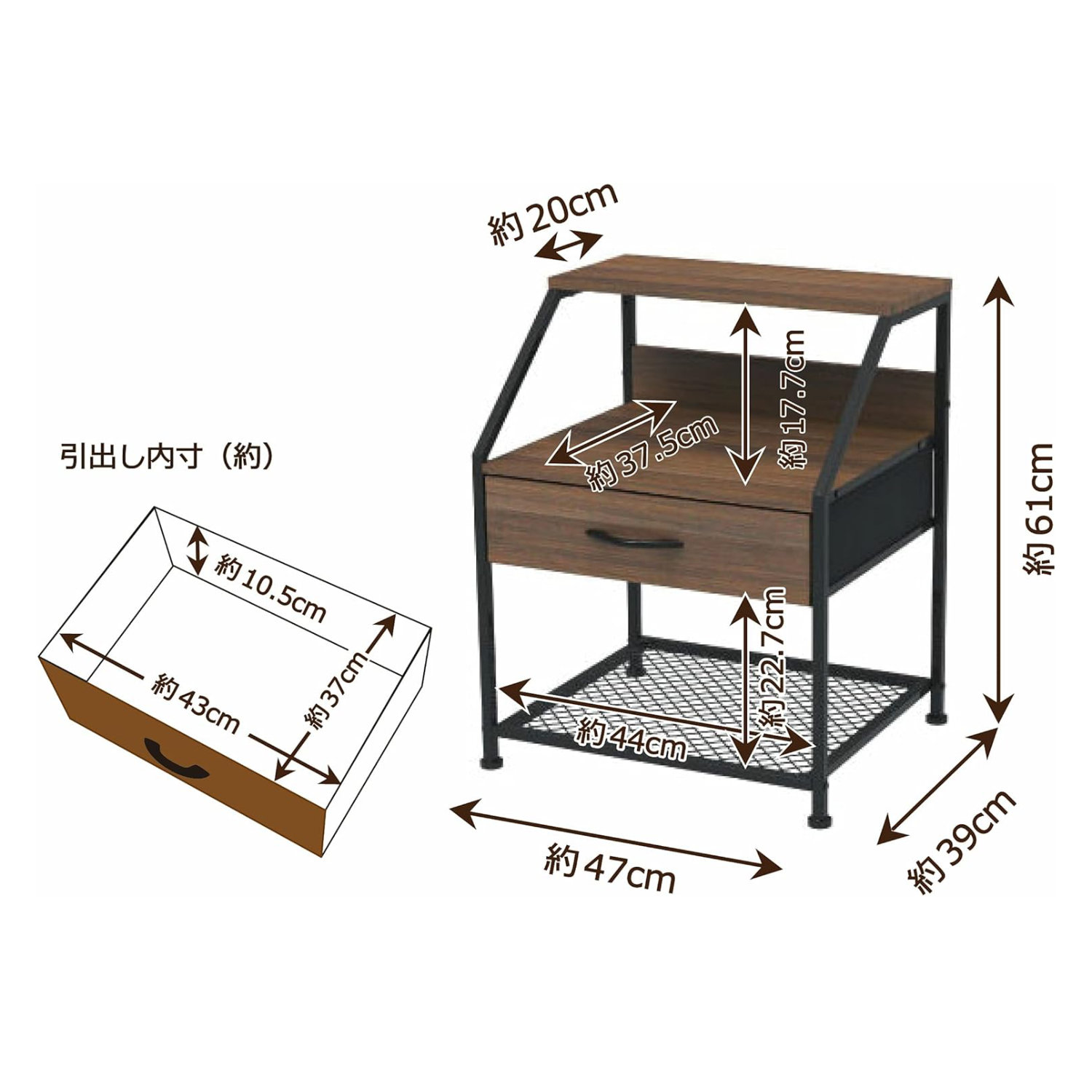 | 天板安全耐荷重 | 天板/5kg、中天板/8kg、引き出し/各3kg |