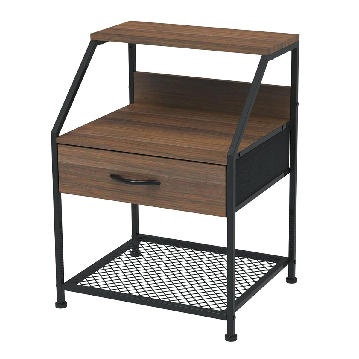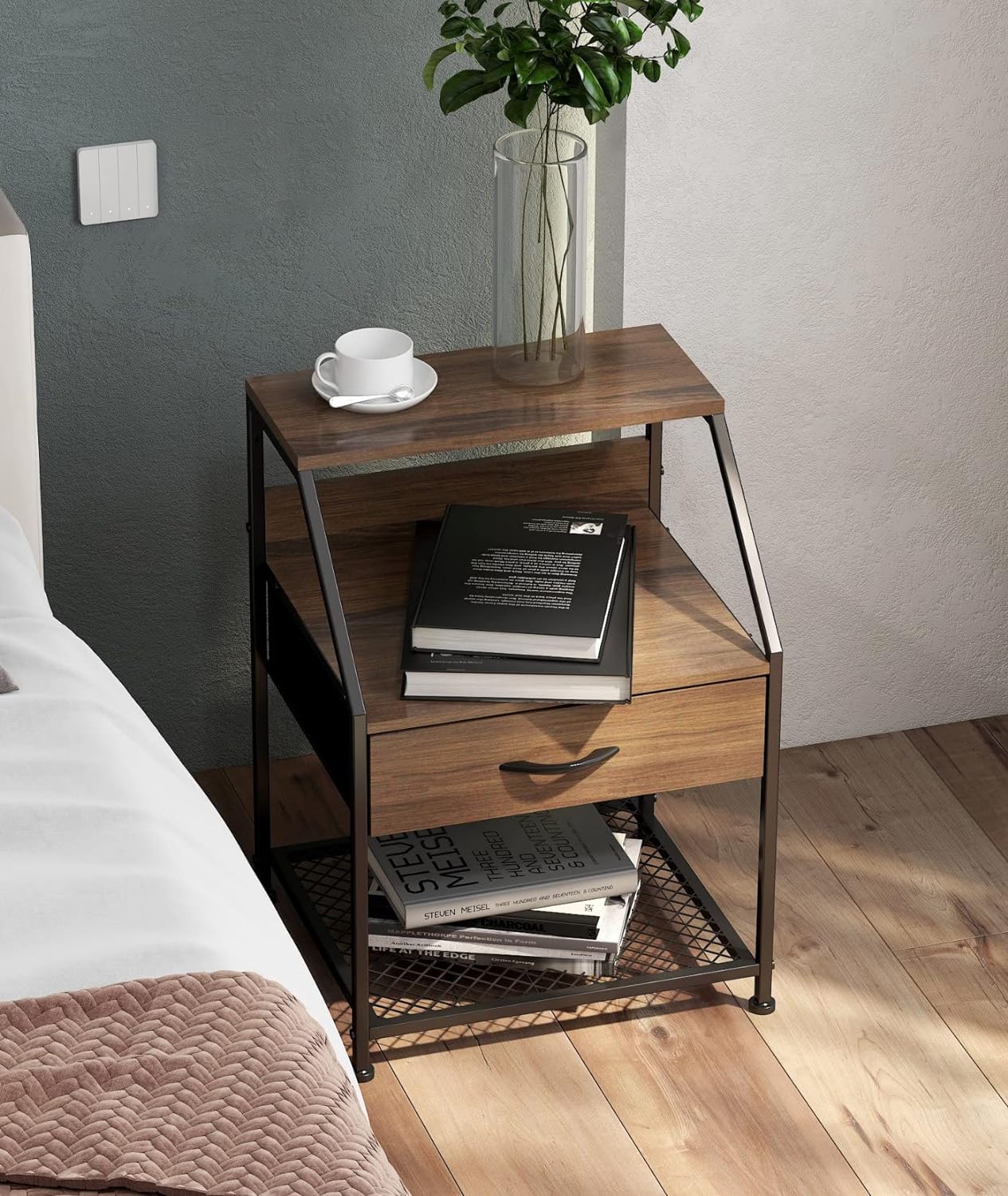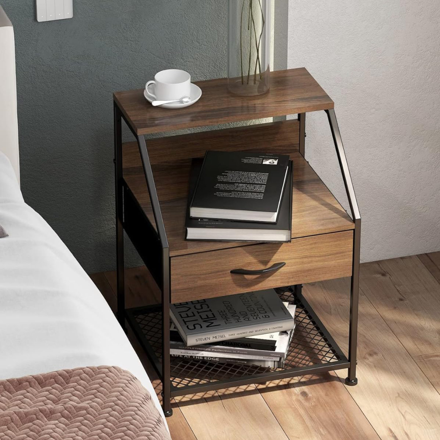 細いアイアンと中天板のオープン部分が軽やかな印象を与える引出し付きのサイドテーブルです。