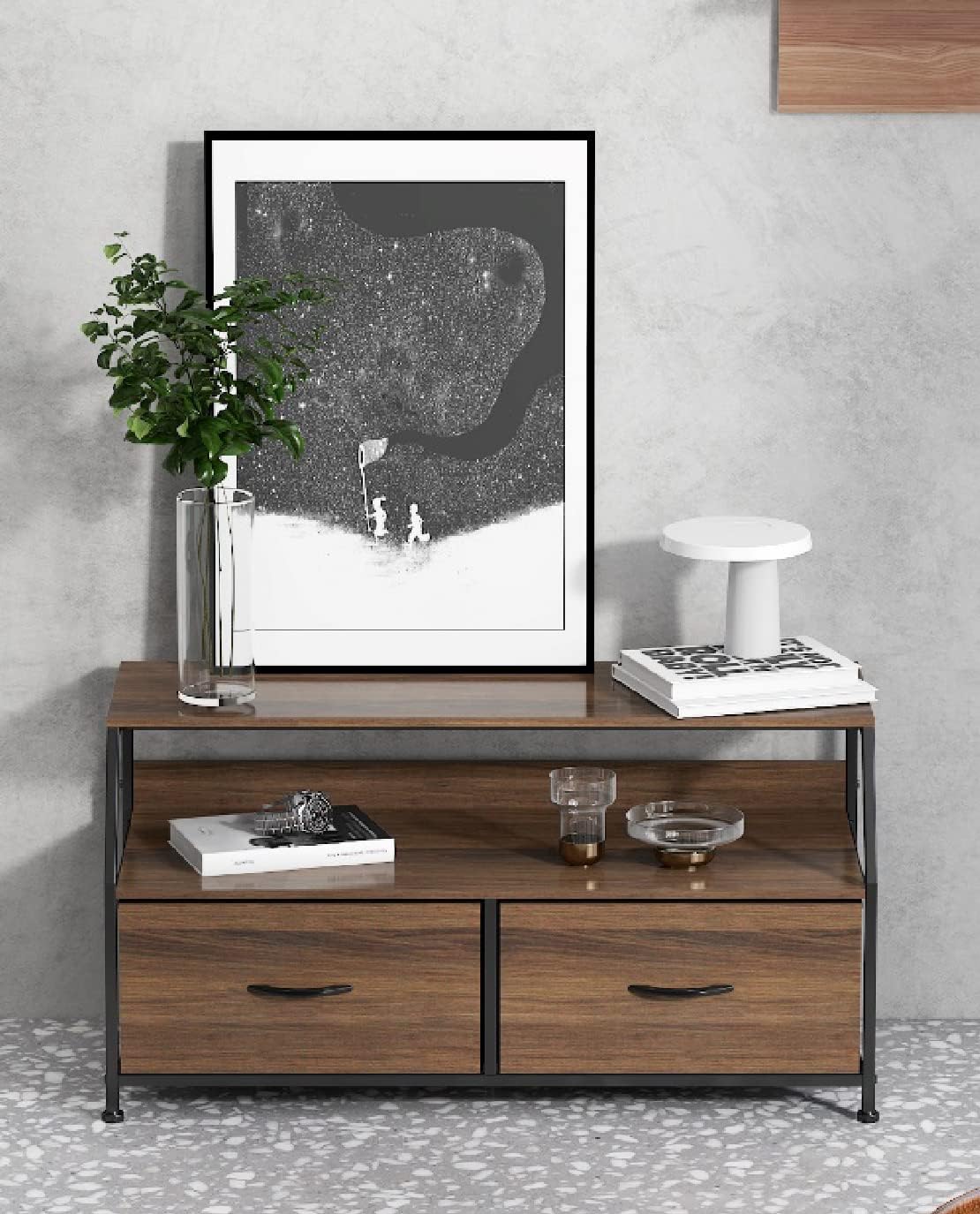 細いアイアンと中天板のオープン部分が軽やかな印象を与える引出し付きのラックです。