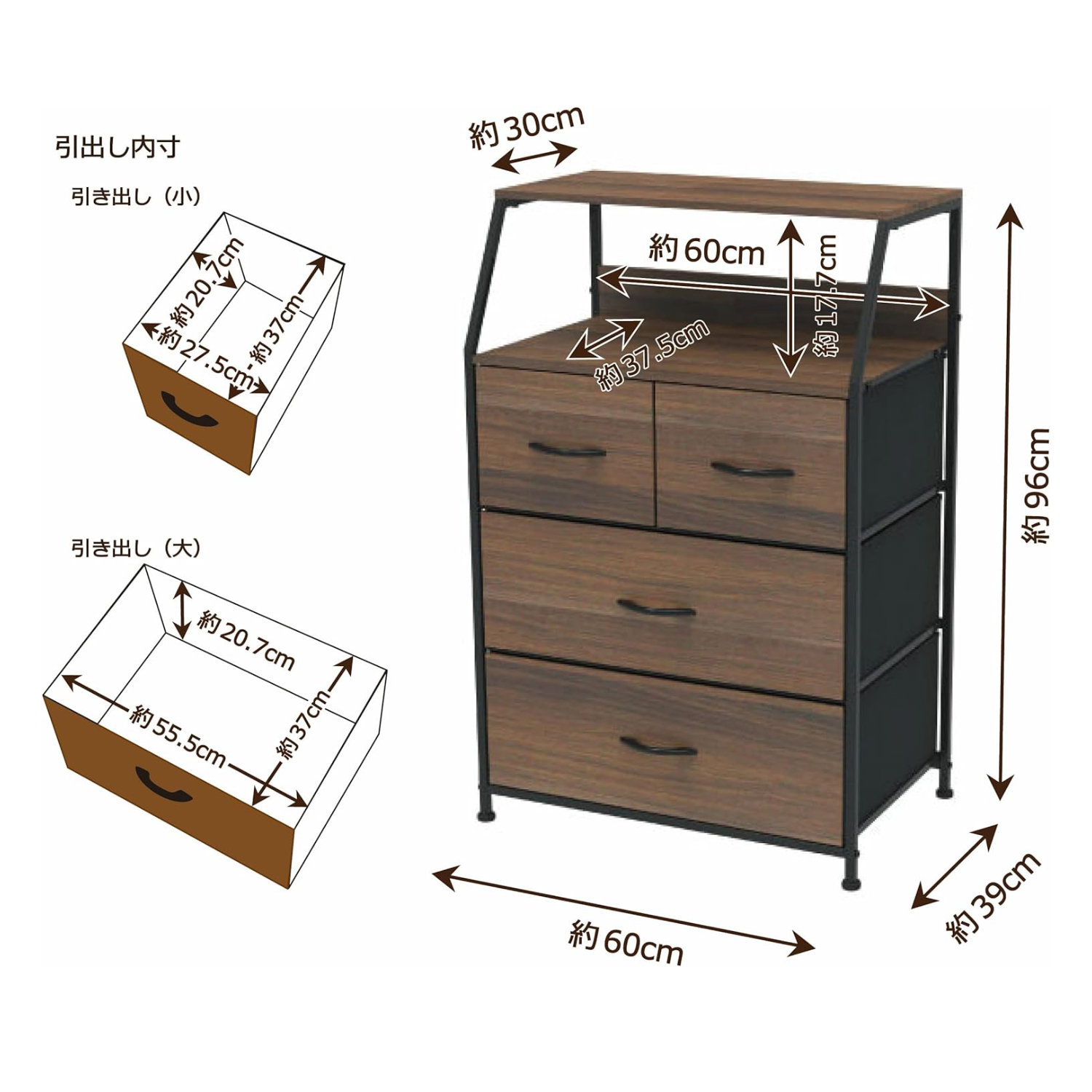 | 引出し内寸サイズ(約) | [大] 幅55.5×奥行37×深さ20.7 cm ×2杯 [小] 幅27.5×奥行37×深さ20.7 cm ×2杯 |