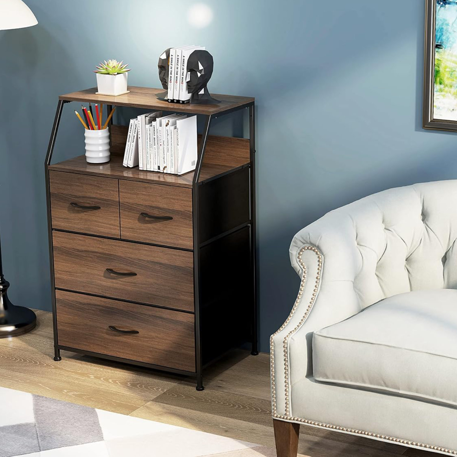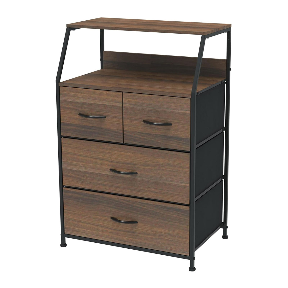細いアイアンと中天板のオープン部分が軽やかな印象を与える引出し付きのラックです。