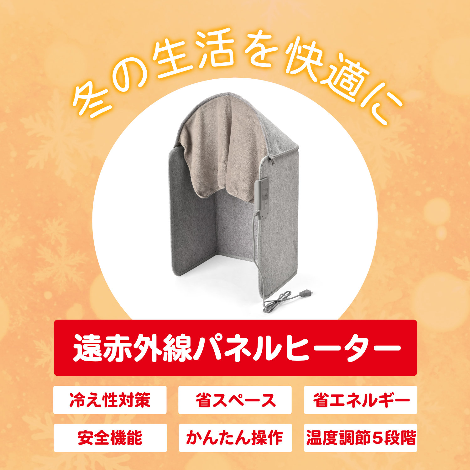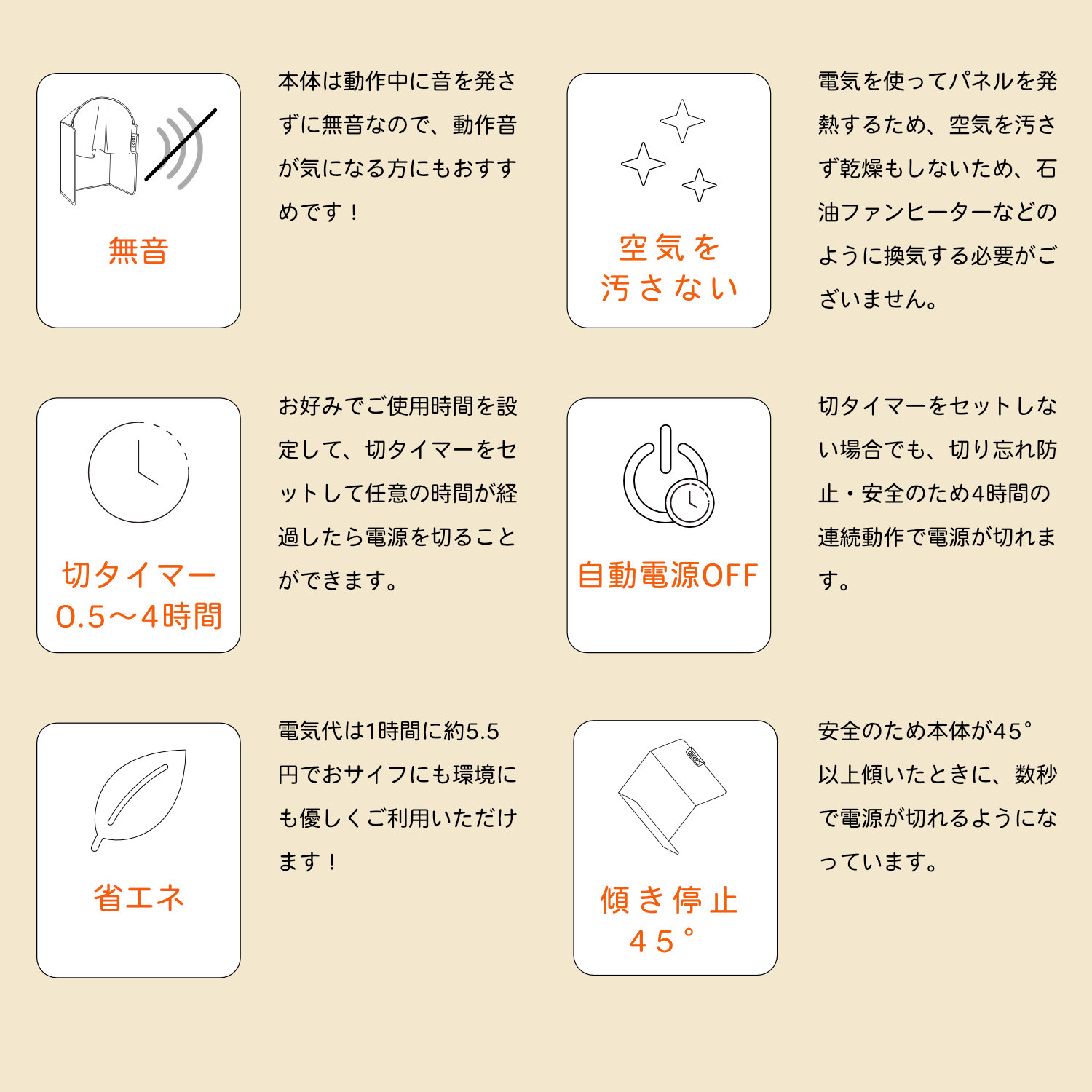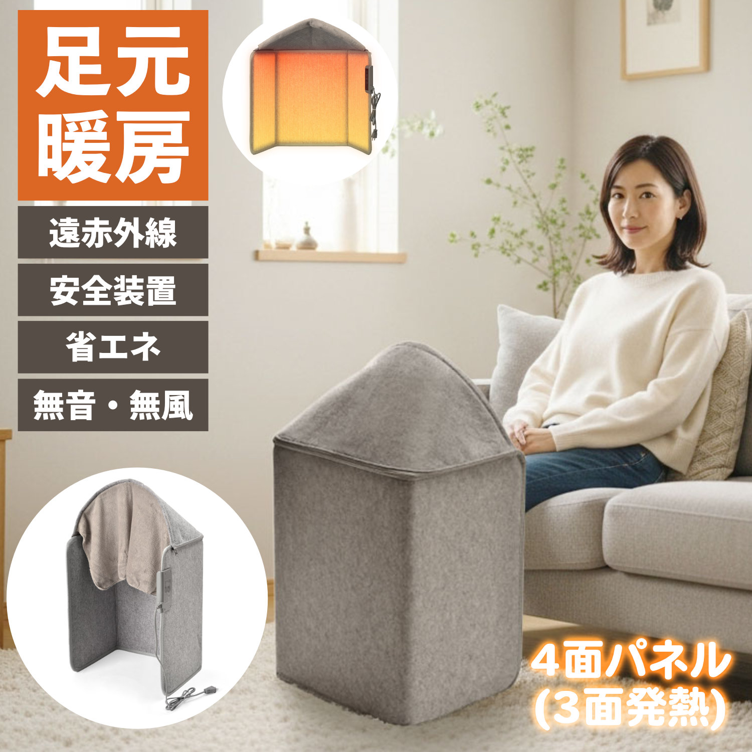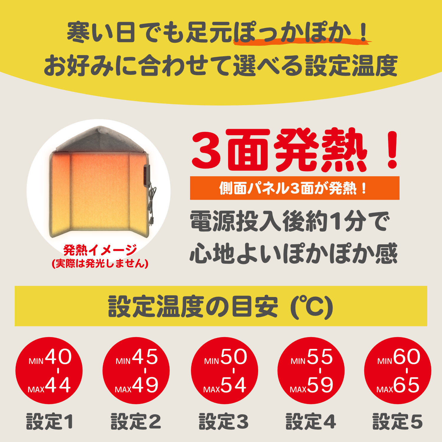 熱源となる3枚のパネル(正面、左右)が遠赤外線を利用した輻射熱で足元をじんわりと温めます。