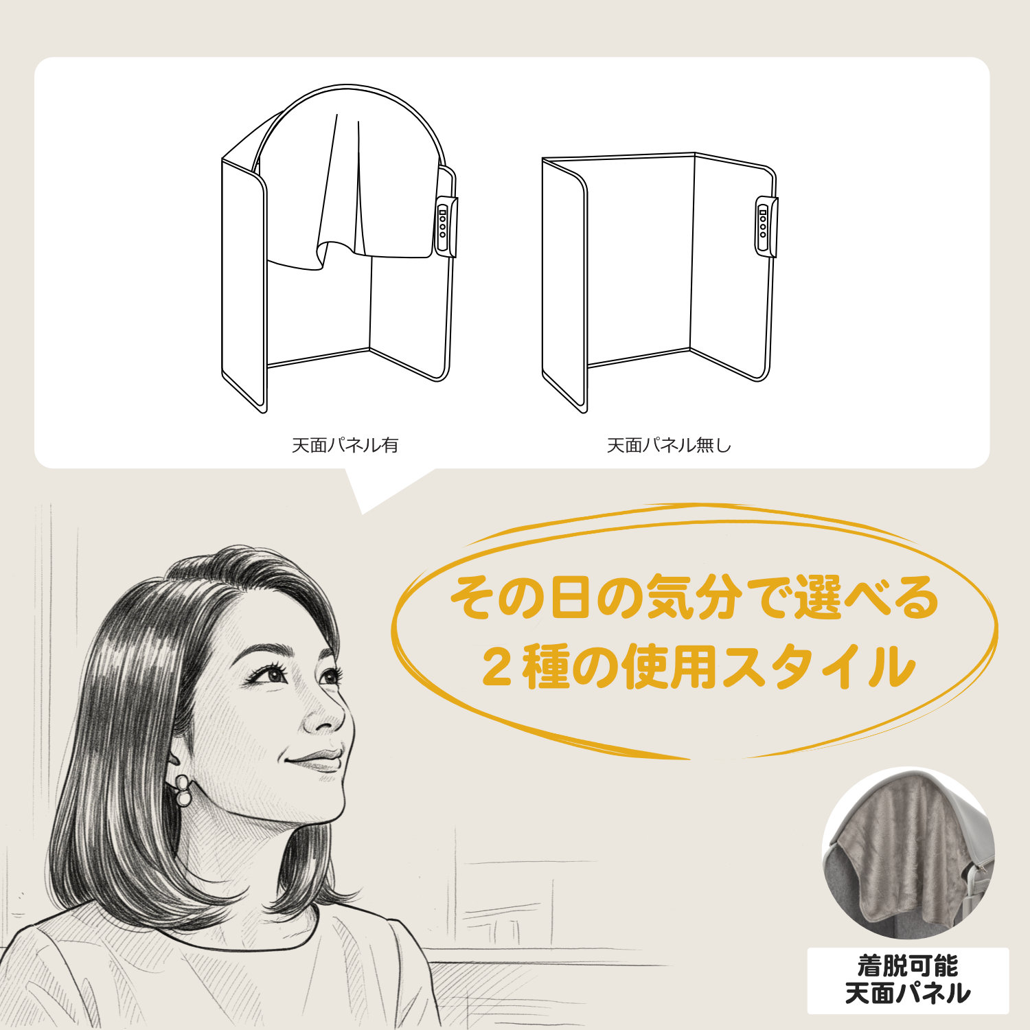 さらに天面パネルを装着することでフタの役割を果たし温かさを逃がしにくい。足元に温かい空気の層を閉じ込めたような状態を作り出します。
