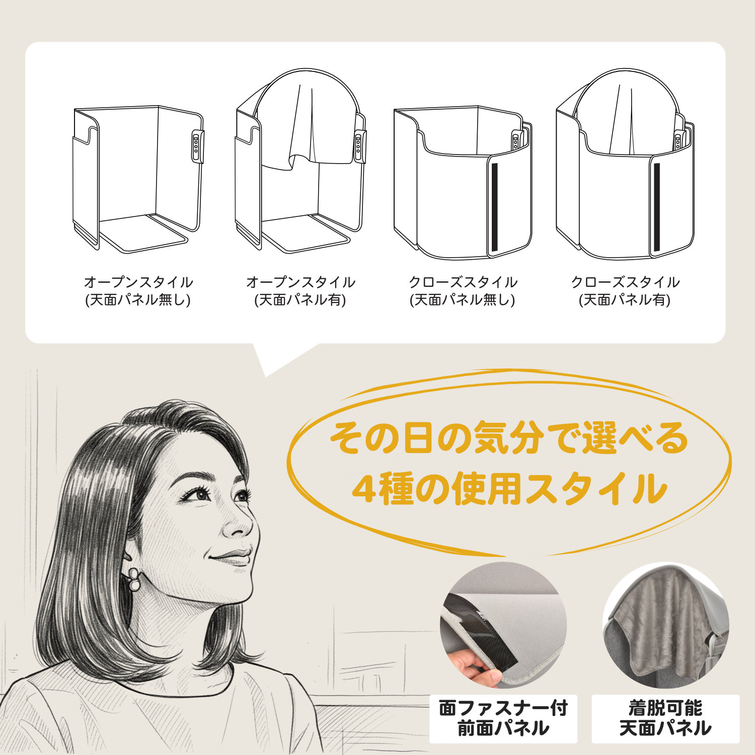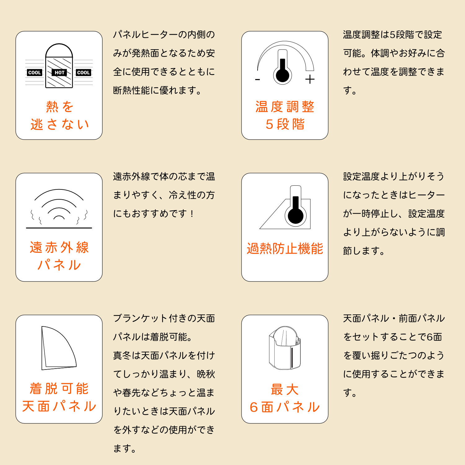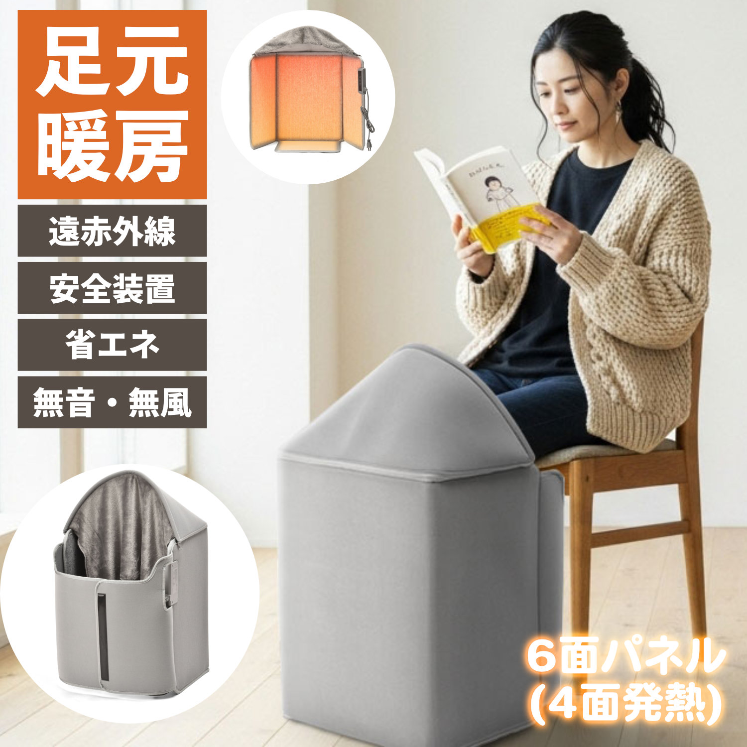 足元をまるっと囲う6面対応可能!(天面パネル・前囲い使用時)熱源となる4枚のパネル(側面3面、足裏1面)が遠赤外線を利用した輻射熱で足元をじんわりと温めます。