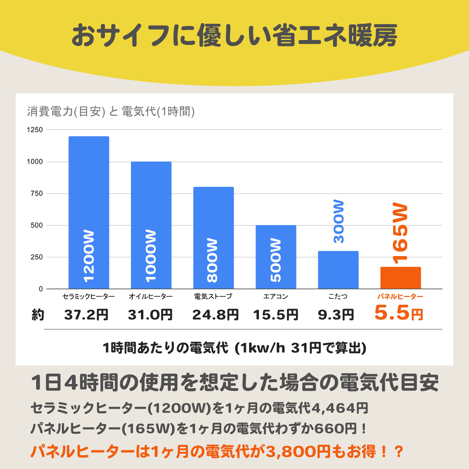 また、消費電力も比較的低く、1時間あたりの電気代は5.5円前後と経済的です。エアコンのように部屋全体を暖める必要がないため、節電にも繋がります。