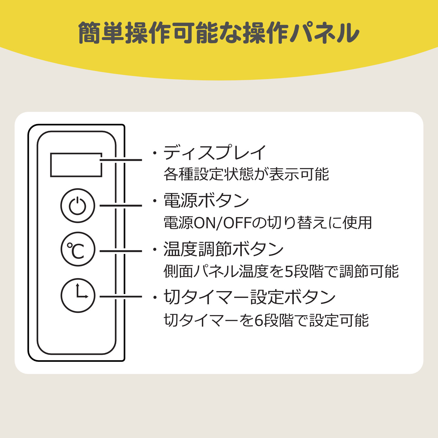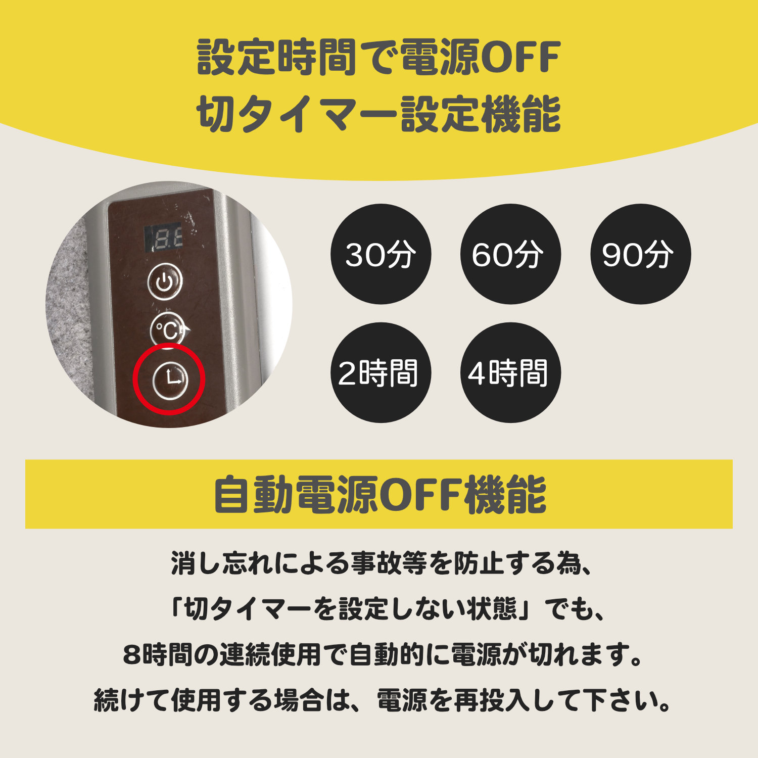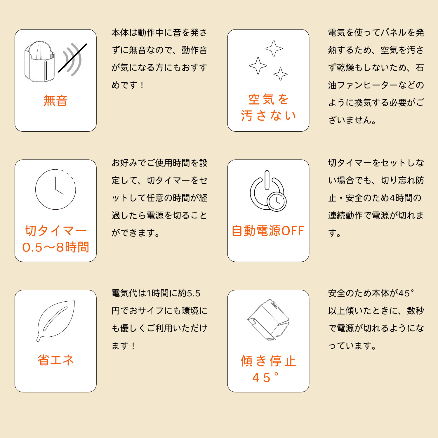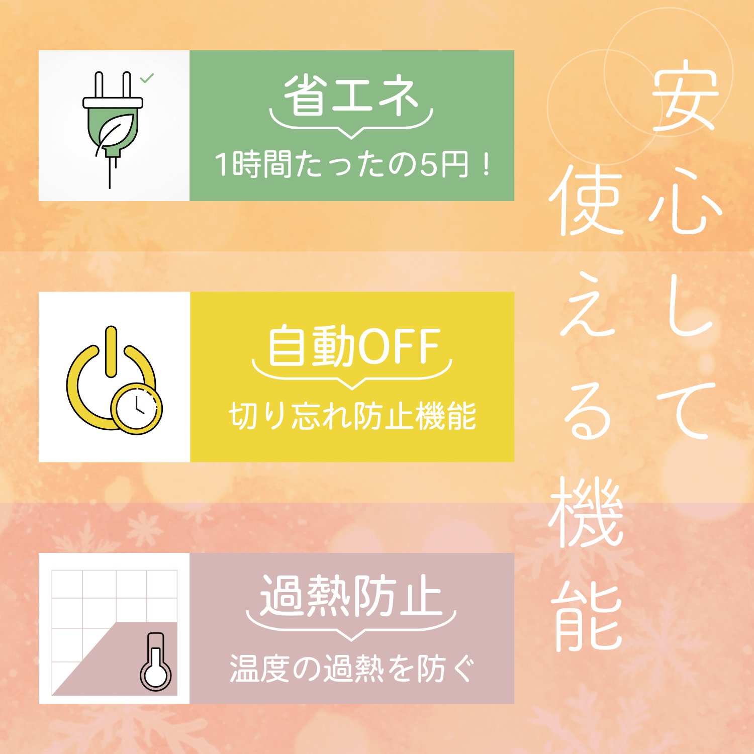 転倒時に自動で電源が切れる転倒OFF機能や、一定時間で自動的に電源が切れるタイマー機能など、安心して使える安全機能が充実!