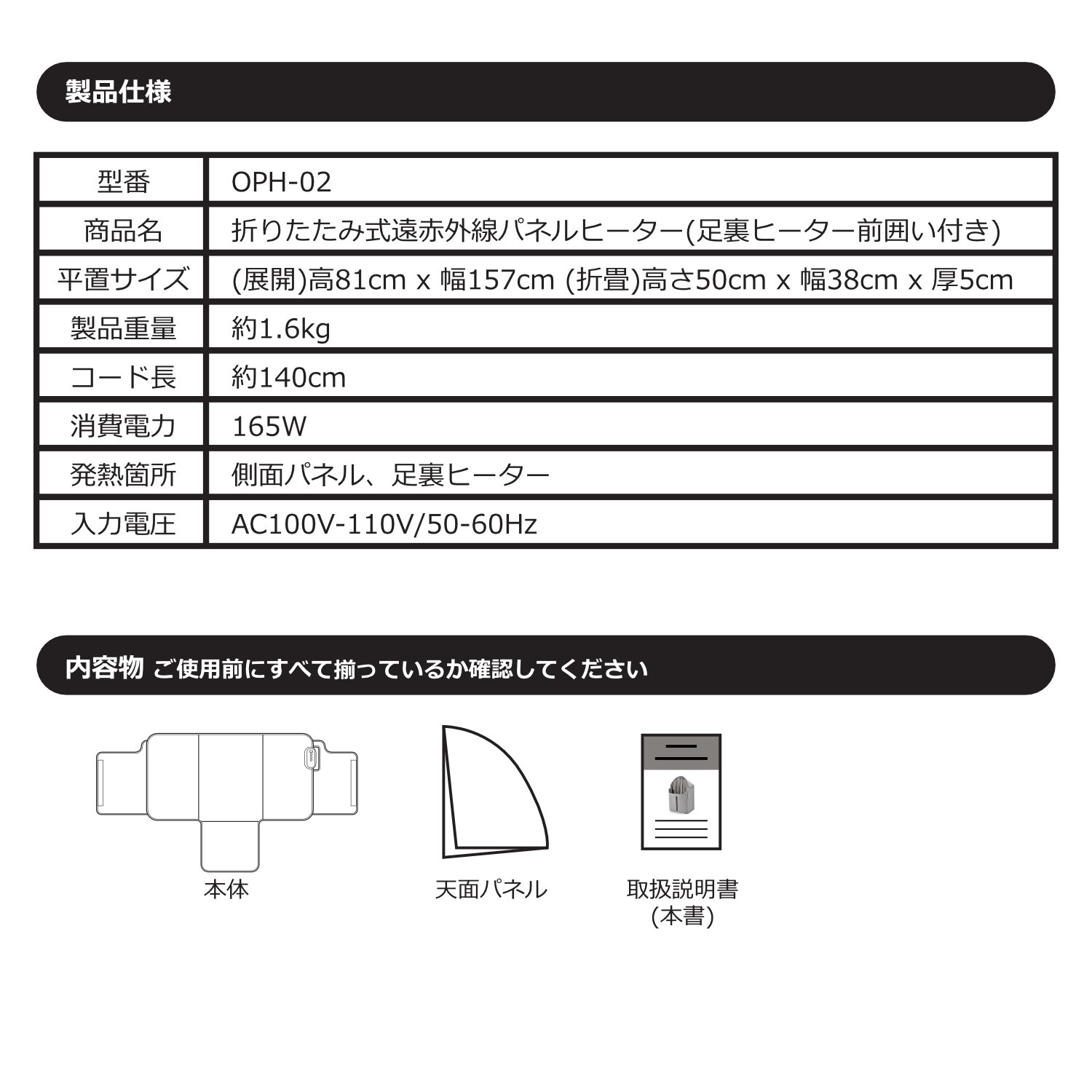 | 型番 | OPH-02 / 折りたたみ式遠赤外線パネルヒーター (足裏ヒーター・前面パネル付き) |