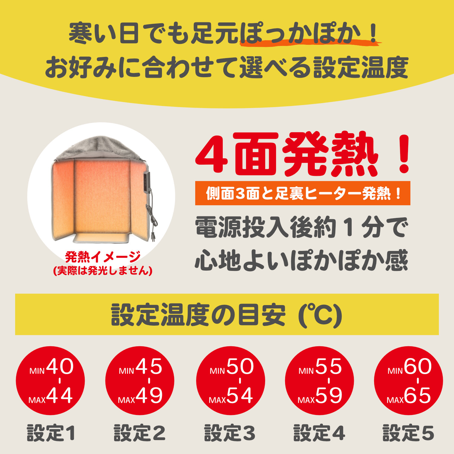 | 発熱箇所 | 側面パネル3面・足裏ヒーター1面(天面パネル・前面パネルは発熱しません) |