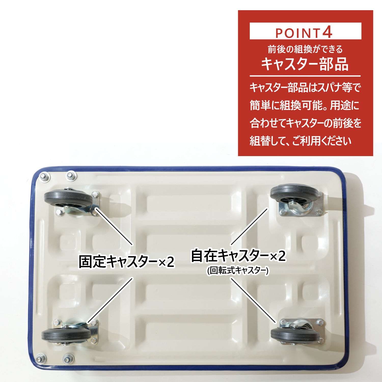 キャスターはスパナ等で簡単に前後の組換可能です。自在キャスターと固定キャスターの前後を用途に合わせてご利用ください。