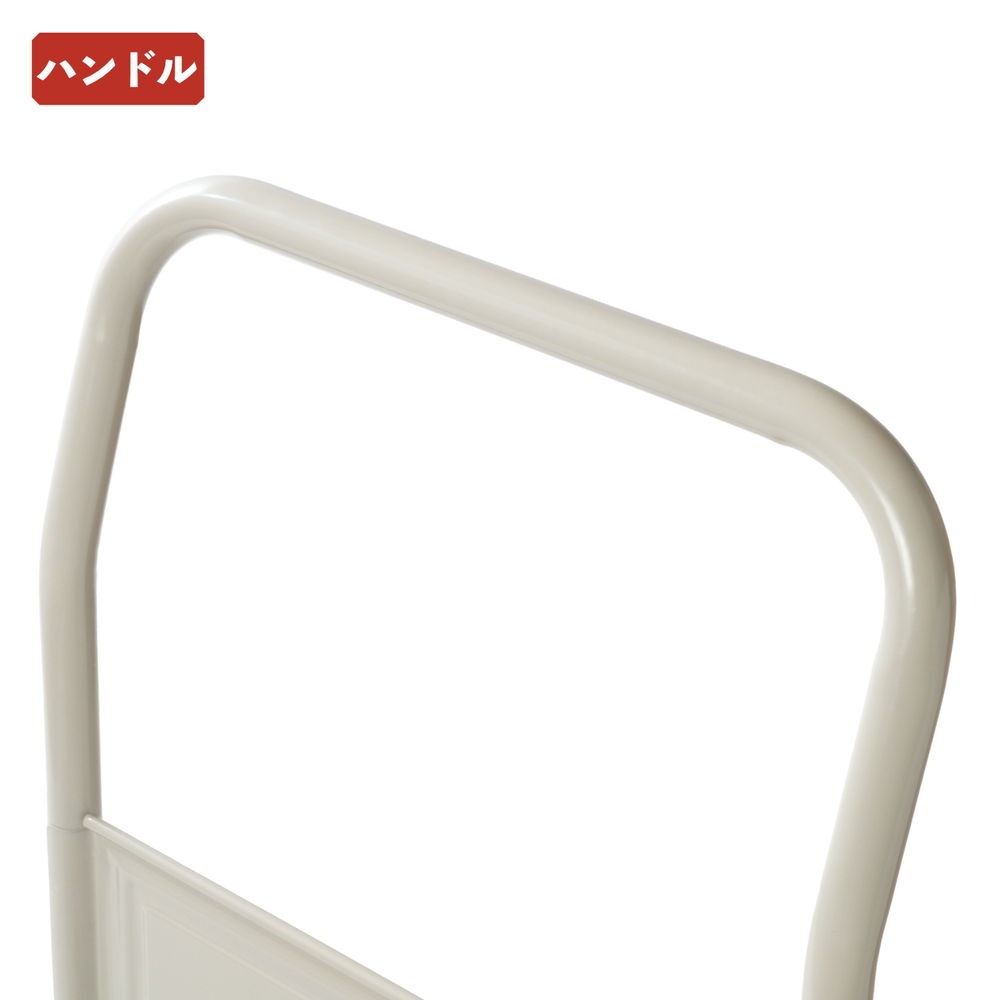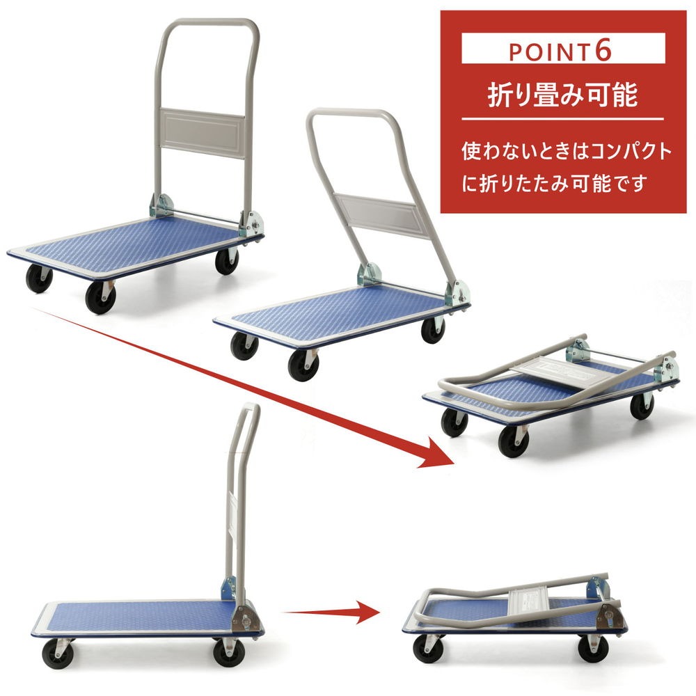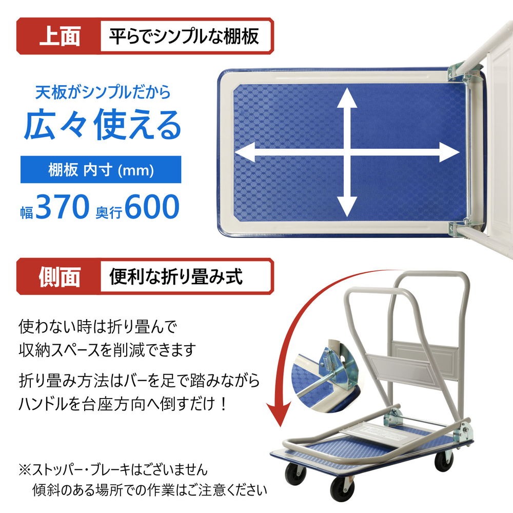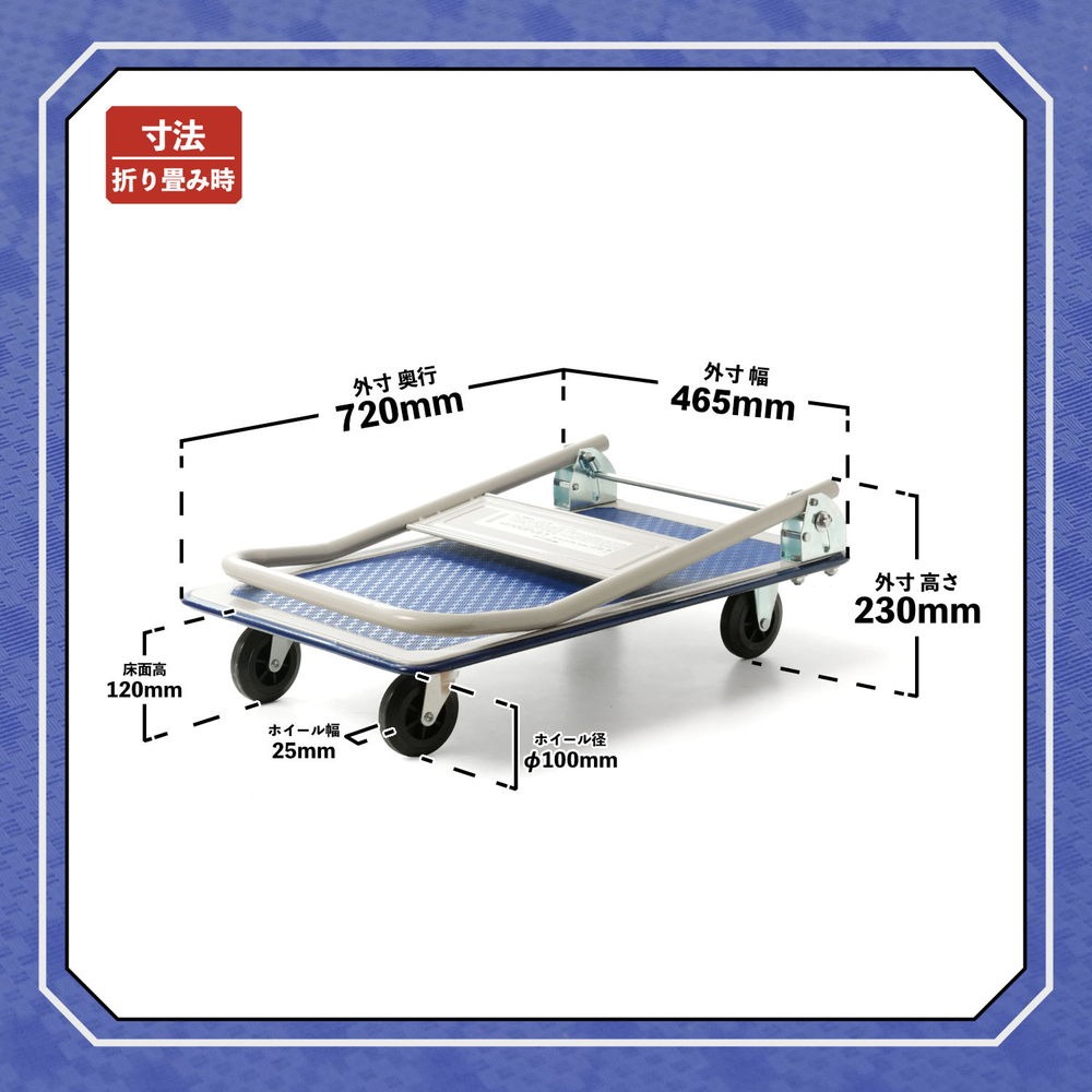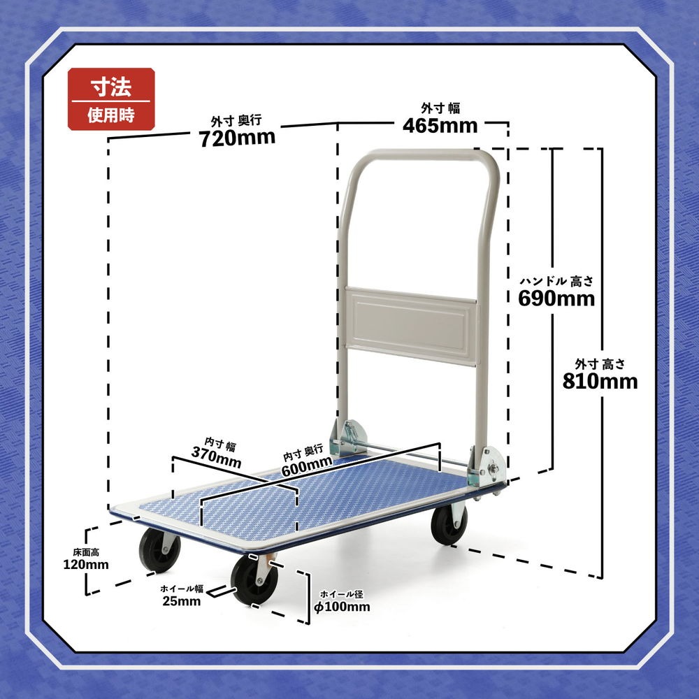 | サイズ | 外寸(使用時) : 幅465×奥行720×高810mm 外寸(折りたたみ時) : 幅465×奥行720×高230mm 積載面 : 幅370x奥行600mm ホイールサイズ : 直径約φ100mm 幅約25mm |