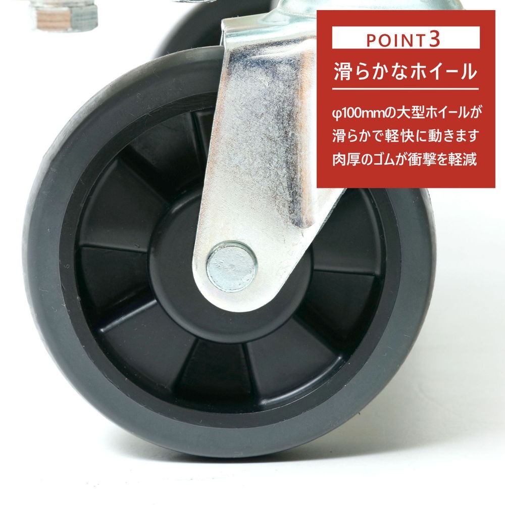 φ100mmの大型ホイールが滑らかで軽快に動きます。肉厚のゴムが衝撃を軽減します!