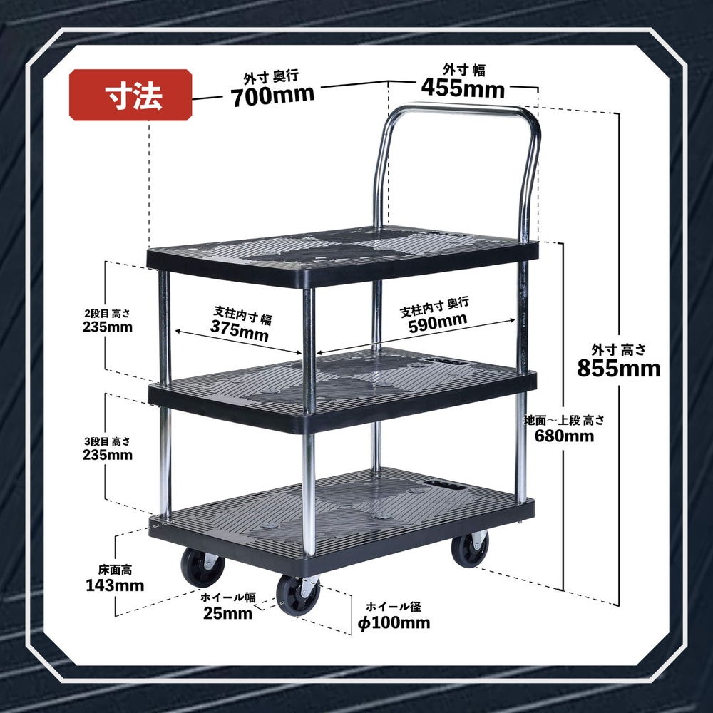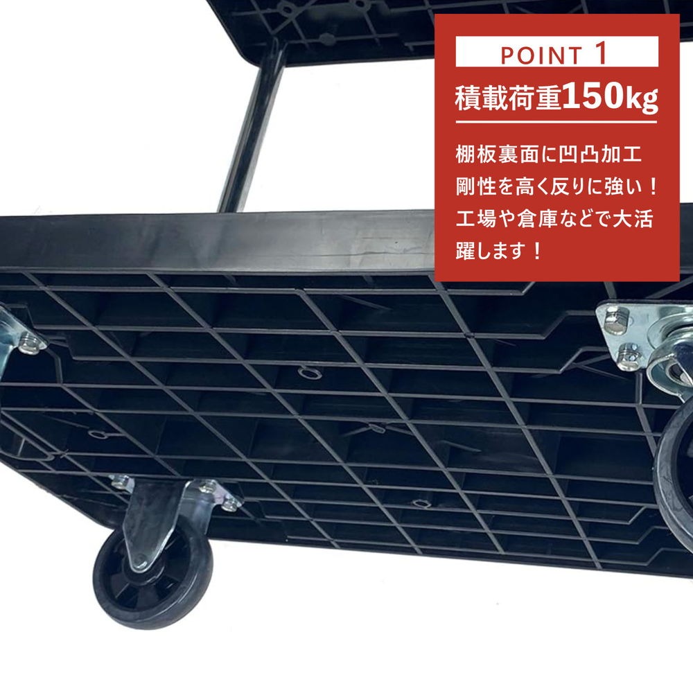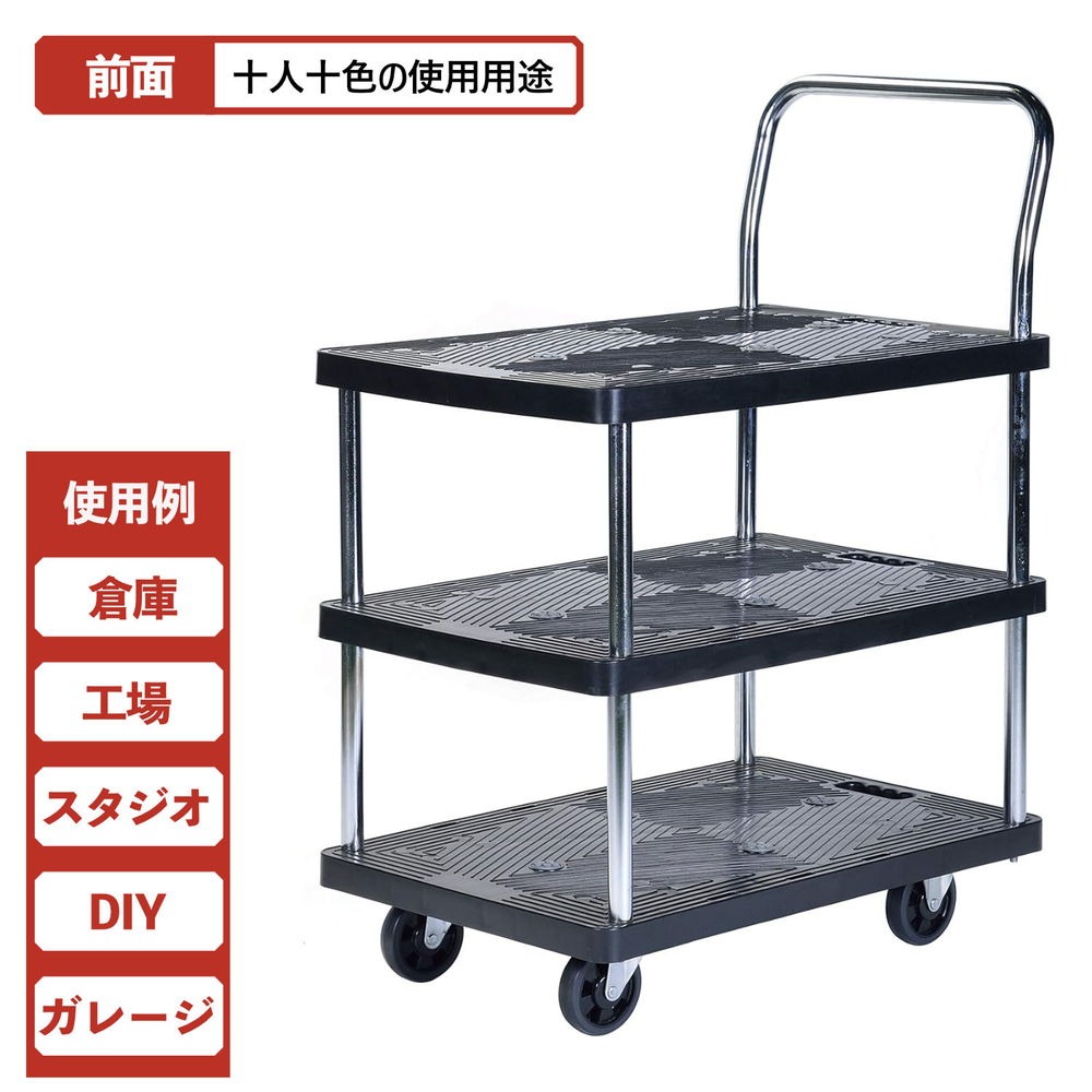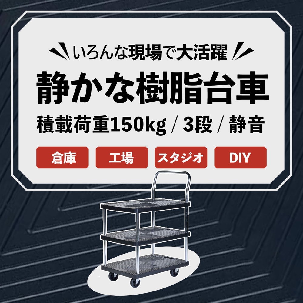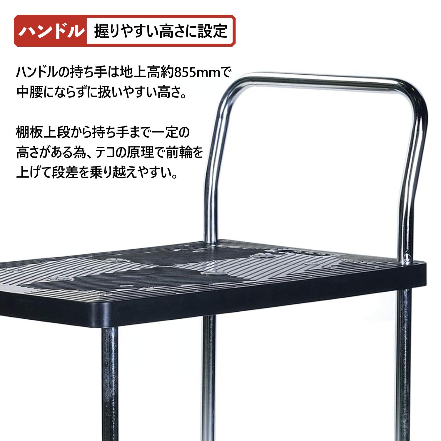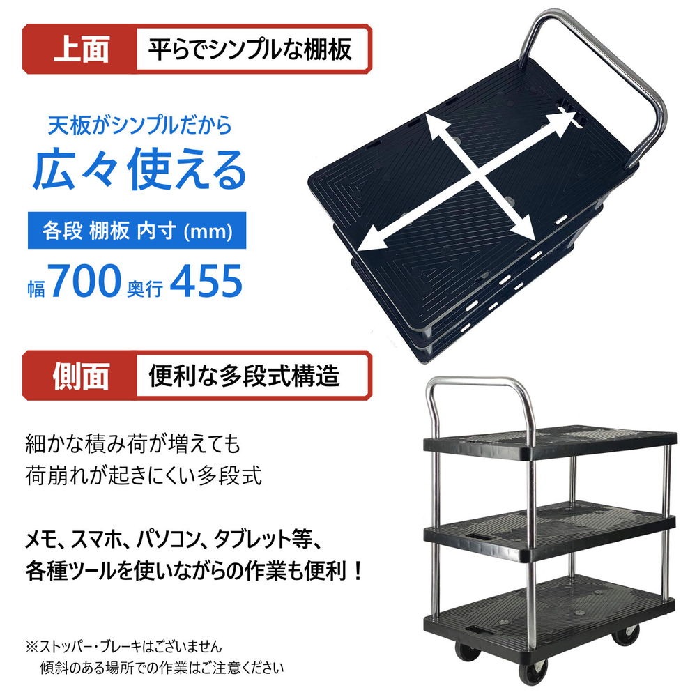 「3段式」の樹脂棚板を採用した積載荷重(耐荷重)150kgの多段式台車です。細かな荷物を運ぶときに荷崩れしにくく大変便利です。上段を簡易的な作業台として利用できるため、ペン、メモ紙、電卓、パソコンを置いて作業の効率化も図れます。
