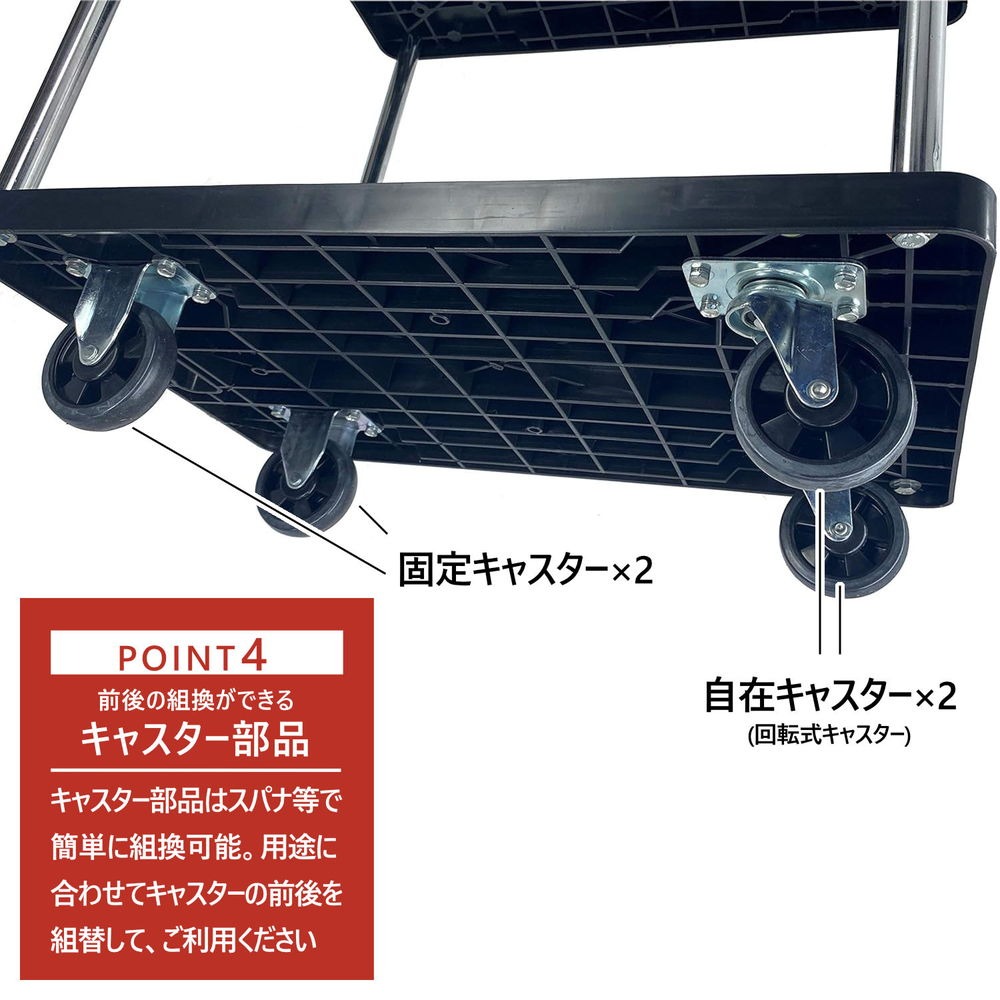 キャスターはスパナ等で簡単に前後の組換可能です。自在キャスターと固定キャスターの前後を用途に合わせてご利用ください