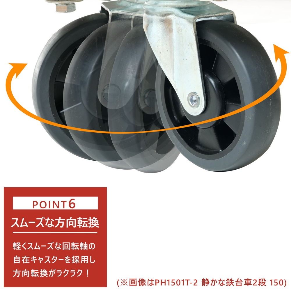 キャスター部品に特殊ベアリングを採用しガラガラ音が少ない静音性を実現しました※凸凹面の多い床など、地面状況によりガラガラ音が出ることがございます。