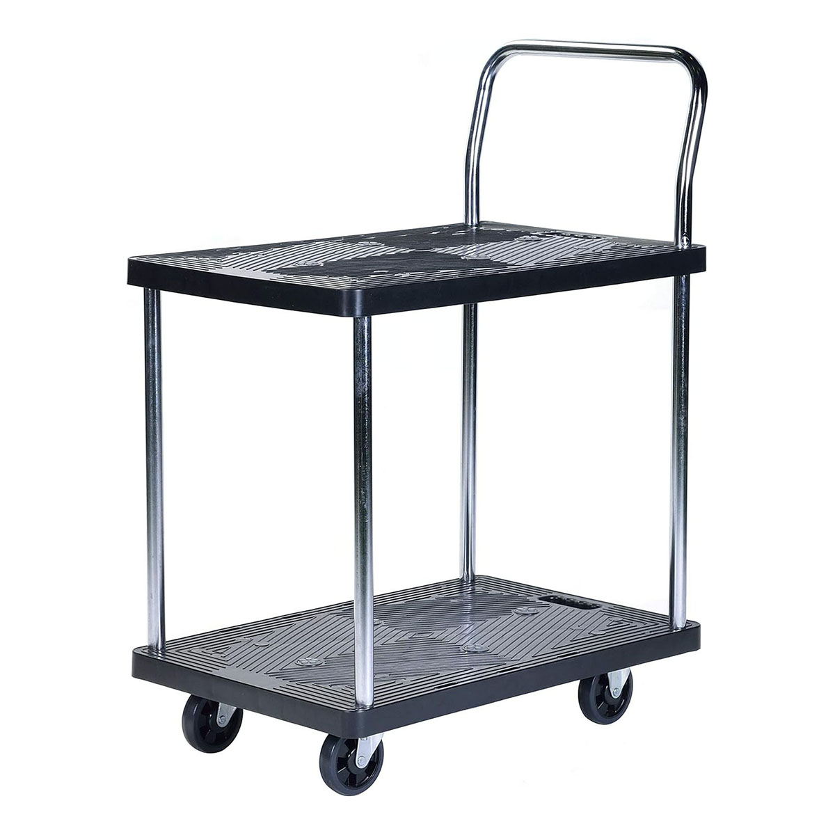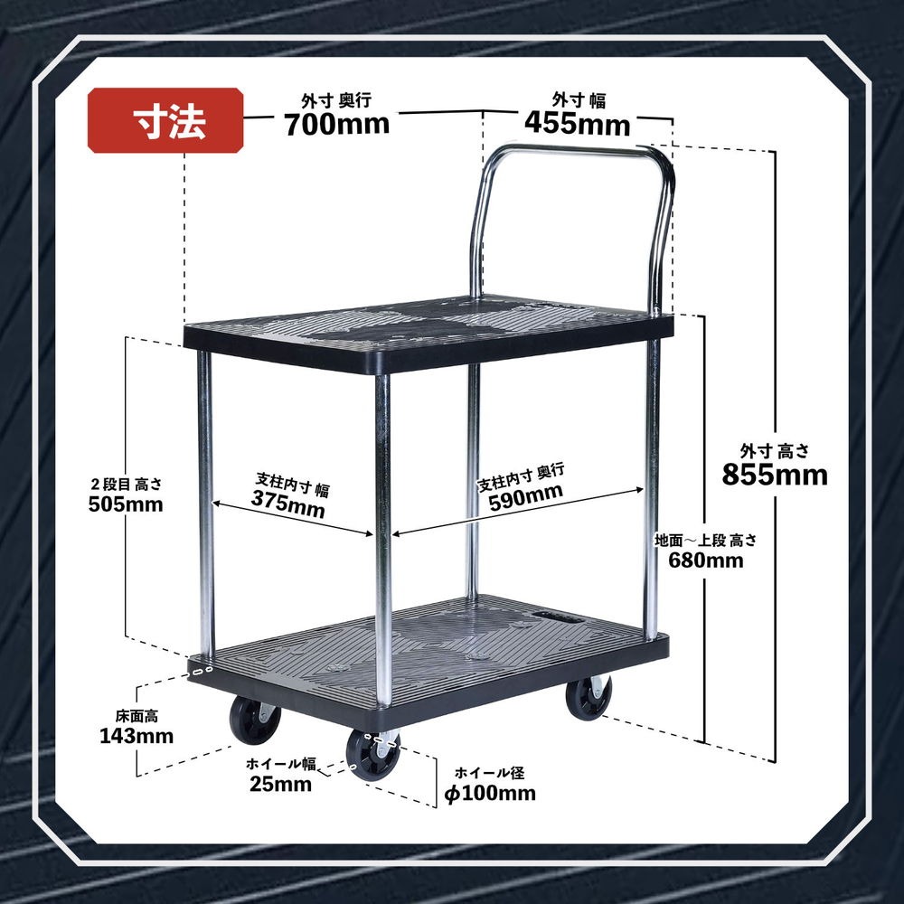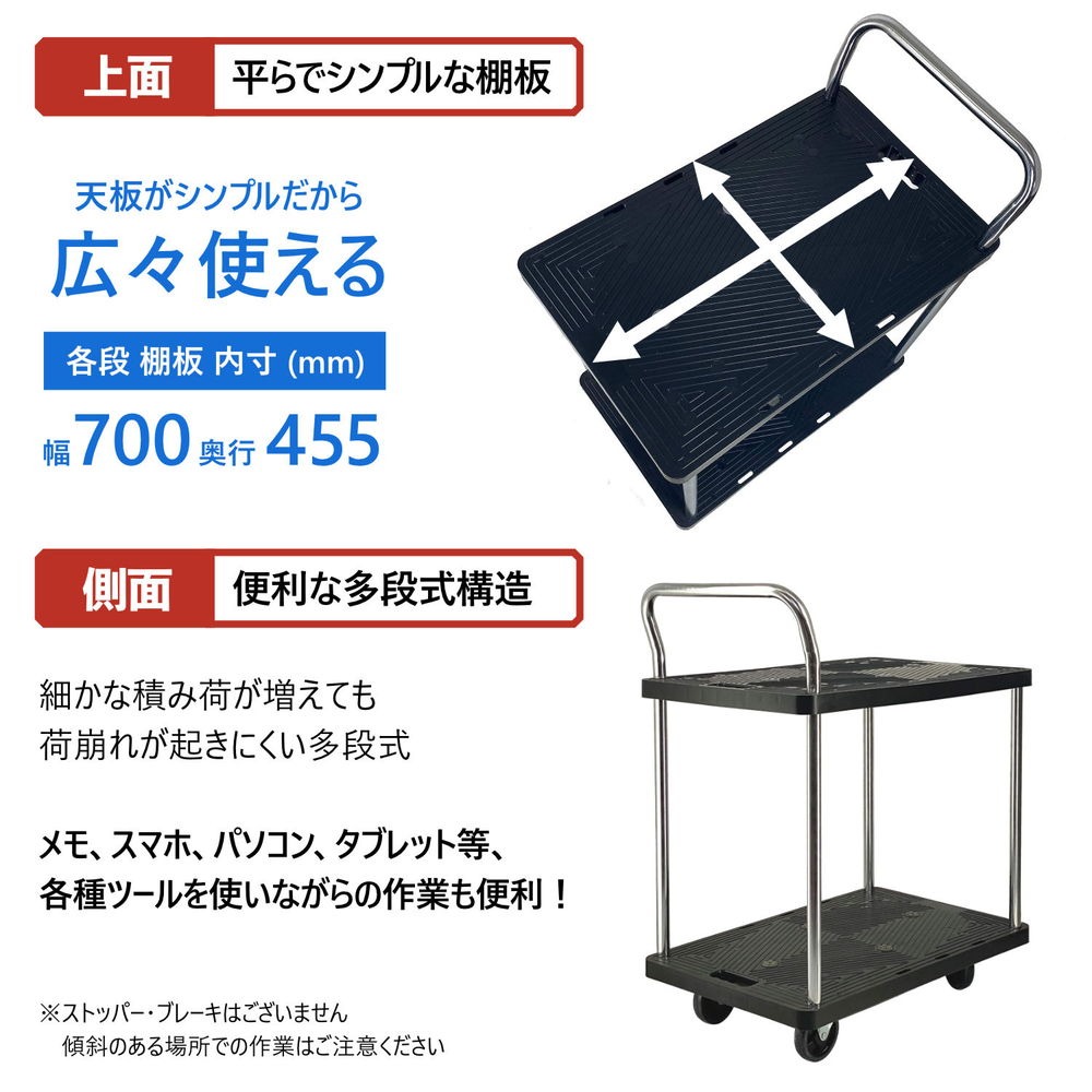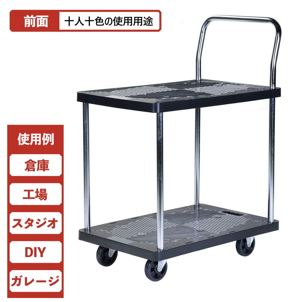 「2段式」の樹脂棚板を採用した積載荷重(耐荷重)150kgの多段式台車です。細かな荷物を運ぶときに荷崩れしにくく大変便利です。上段を簡易的な作業台として利用できるため、ペン、メモ紙、電卓、パソコンを置いて作業の効率化も図れます。