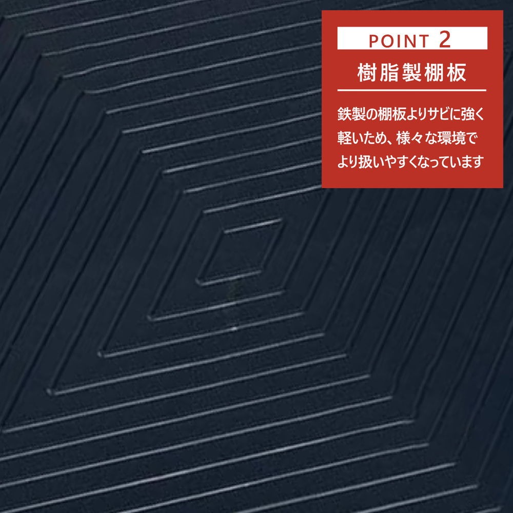 棚板は樹脂製で、鉄製の棚板よりサビに強く、軽いため扱いやすくなっています。